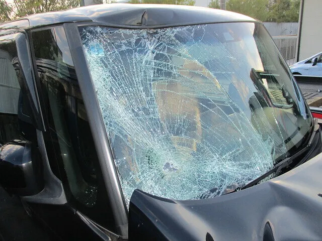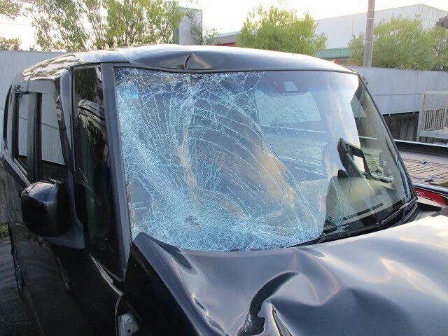 今回は、フロントガラスが大きくひび割れ、ボンネットにも大きなへこみが。幸い、走行中の事故ではなかったため、乗車していた方への被害はありませんでしたが、車両の損傷は深刻。