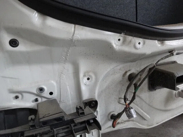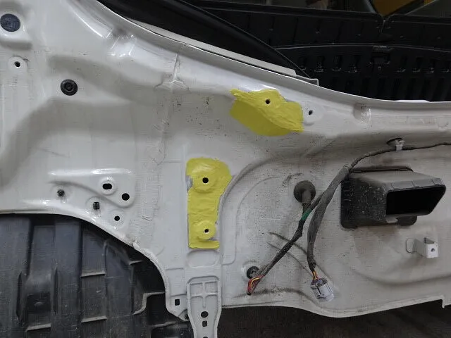 まず入庫時の状態確認では、外側からの凹みに加えて内側のパネルにも歪みや擦り傷がありました。