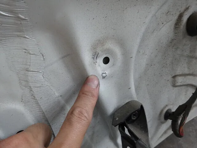 そこで、内張りを外して内部の状態を詳しく点検を実施。指で触れるとパネルの裏側にまで打痕が伝わっており、見えない部分の損傷も明らかになりました。