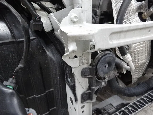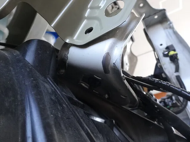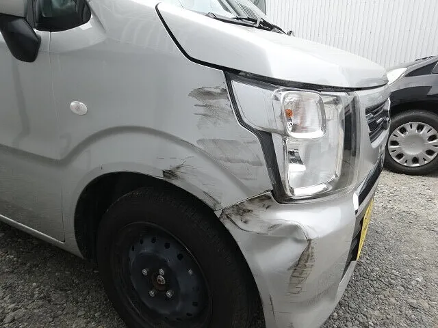 バンパーやフェンダーに大きな変形が見られ、ヘッドライト周辺の取付部も押されてズレが発生。