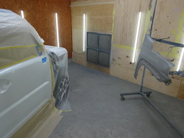 塗装工程では、ハスラー特有のツートンカラーを忠実に再現するため、ボディ色と樹脂部との境界をマスキングし、専用ブース内でグラデーション塗装を行いました。