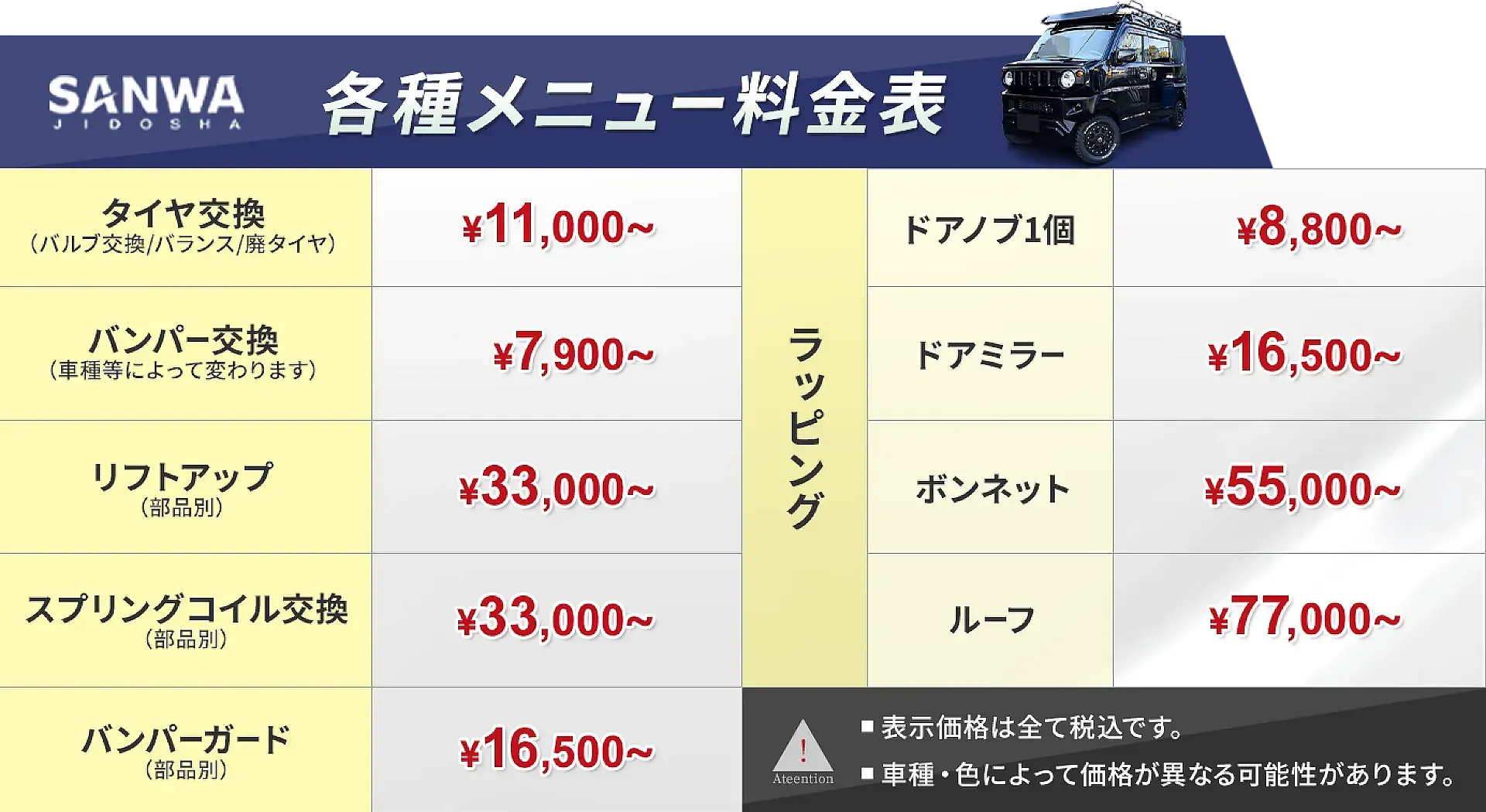 ハスラー、ジムニー、エブリイなどの軽カスタムなら、実績豊富な三和自動車へ。掛川市の方はもちろん、浜松市、菊川市、袋井市、島田市などにお住まいの方もお気軽にお問合せください。