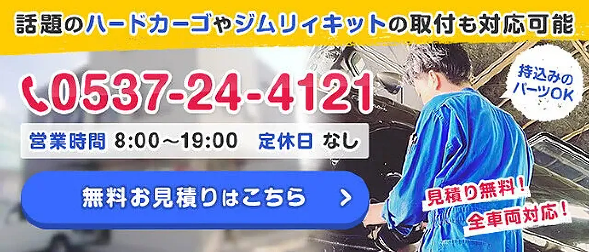 掛川市にある三和自動車では、国産全メーカーのカスタムを対応しております。ネットで購入されたパーツの持込みや当店への直送も大歓迎。また、今話題のハードカーゴやジムリィキットの取付も可能です。