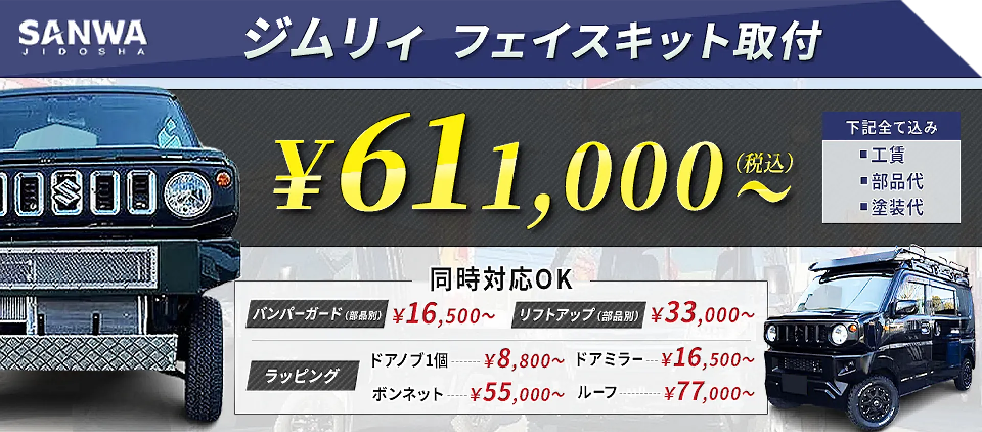 静岡県掛川市にある三和自動車は、国内でも有数のジムリィフェイスキットの取り扱い専門店です。
