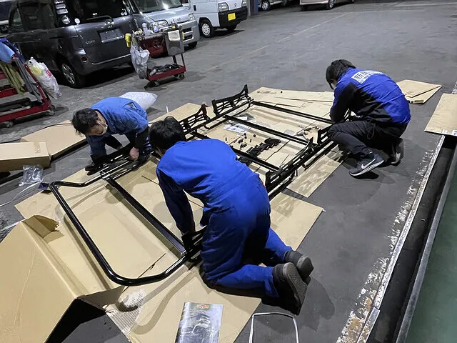 キャリアの積載は複数人がかりで行います。ボルトとセンターバーをしっかり締め込んだら取付完了。